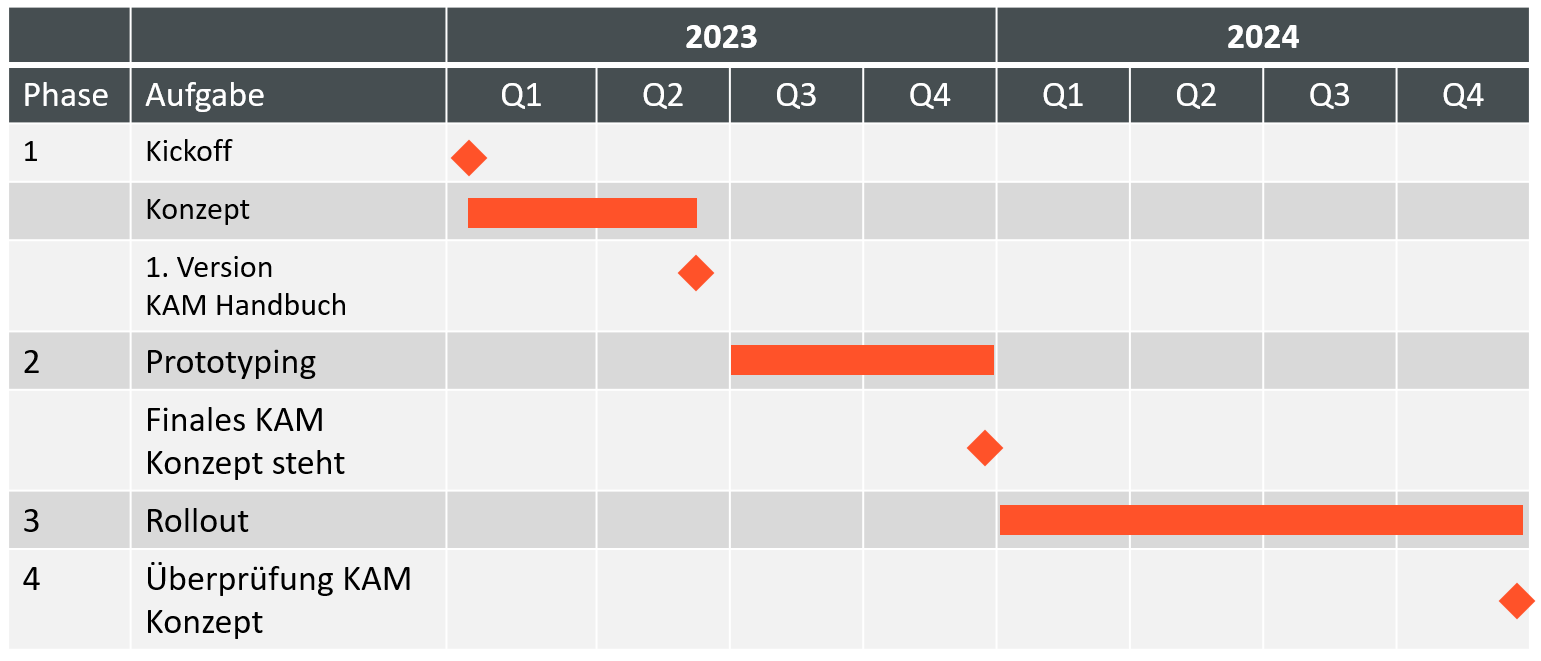 Key Account Management lässt sich weder durch eine 2 Tages Schulung noch einfach nebenbei einführen! Die KAM Einführung ist ein (Change) Projekt. In der Praxis hat es sich bewährt mit einer kurzen Konzeptphase zu starten, dann aber die Vorgehensweise in einer Prototyping Phase mit wenigen ausgewählten Key Accounts zu erproben und weiterzuentwickeln. Am Ende dieser Prototyping Phase steht dann Ihr finales KAM Konzept, welches Sie in einem KAM Handbuch beschreiben können. Danach folgt der Roll-out auf weitere Key Accounts bzw. Standorte, Länder oder Gesellschaften.
