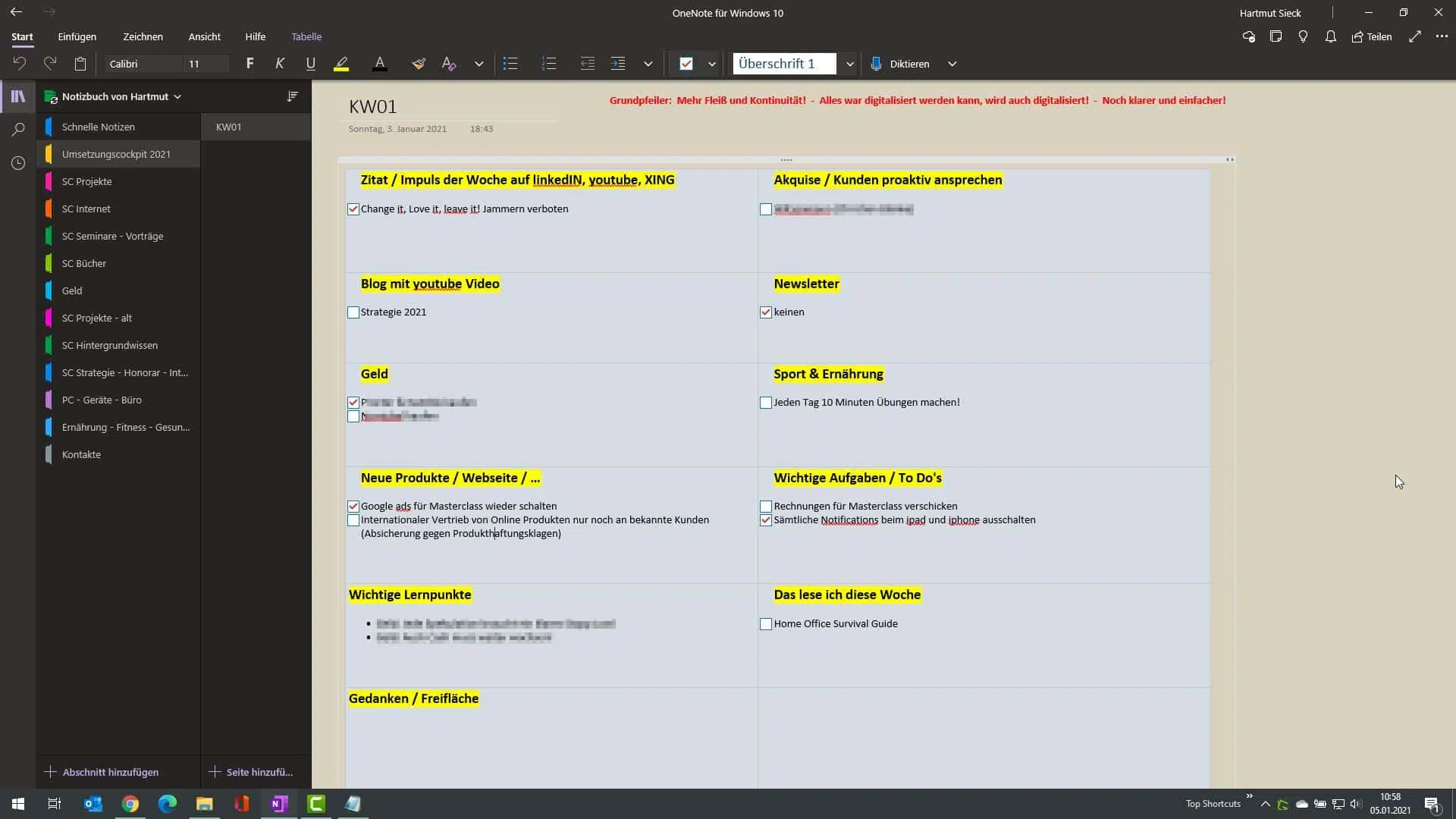 Der Sonntagmorgen ist meine Me-Time, um die Schwerpunkte, Themen, wichtige To-Dos für die nächste Woche festzulegen. Um dabei sicherzustellen, dass ich keine Aspekte übersehe bzw. vergessen, nutze ich ein Cockpit. In OneNote gibt es pro Woche eine Seite. Anhand dieser Seite gehe ich alle Bereiche strukturiert durch und halte meine To-Dos für die nächste Woche schriftlich fest. Durch die Aufgaben-Markierung kann ich die To-Dos einfach abhaken. Dank der guten Vernetzung von OneNote und Outlook kann ich auch mit einem Klick aus jeder Notiz sofort eine Outlook Aufgabe machen und der Status der Erledigung wird auch noch im Hintergrund automatisch synchronisiert.