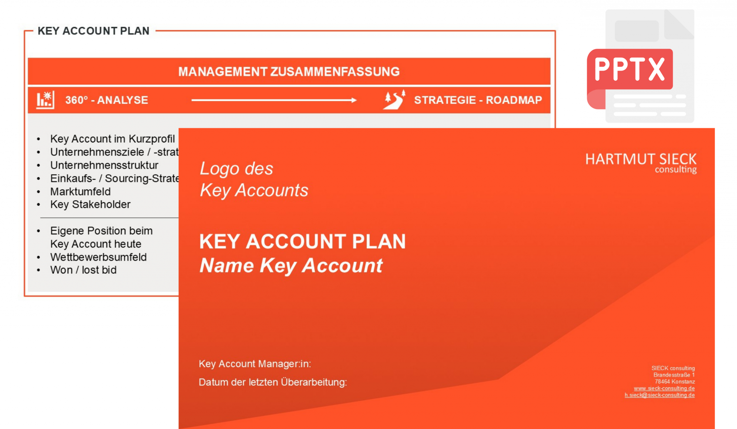 Die Key Account Plan Vorlage in deutscher und englischer Sprache im PowerPoint (pptx) Format direkt nach der Registrierung herunterladen.